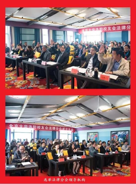 北京大学洛阳校友会常务理事赵大伟介绍法律分会筹备情况,会长郭引强宣读北京大学洛阳校友会拟提议法律分会导机构人选,与会校友代表举手表决,选举赵大伟任法律分会会长,袁志生任法律分会副会长兼秘书长,杨迅波任法律分会副会长。会上,北京大学法学院党委副书记、校友会副会长路姜男致辞,从凝聚校友、服务校友、助力校友三个方面介绍法学院校友工作情况及取得的成绩。北京大学法学院院长、法学院校友会会长潘剑锋发表讲话,从北京大学师生规模及构成、教学、科研、际交流、硬件设施等方面介绍了法学院近年来的主要工作和取得的喜人成绩,与会校友备受鼓舞,十分振奋。潘剑锋院长还向洛阳校友会颁发了赠送母校300株牡丹花的捐赠证书。