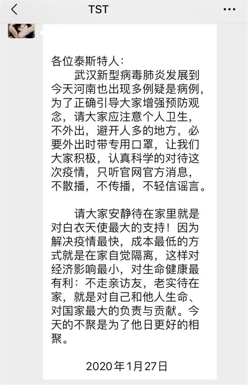 面向全体员工发布“告全体泰斯特人书”,统一全员思想,对抗疫情。