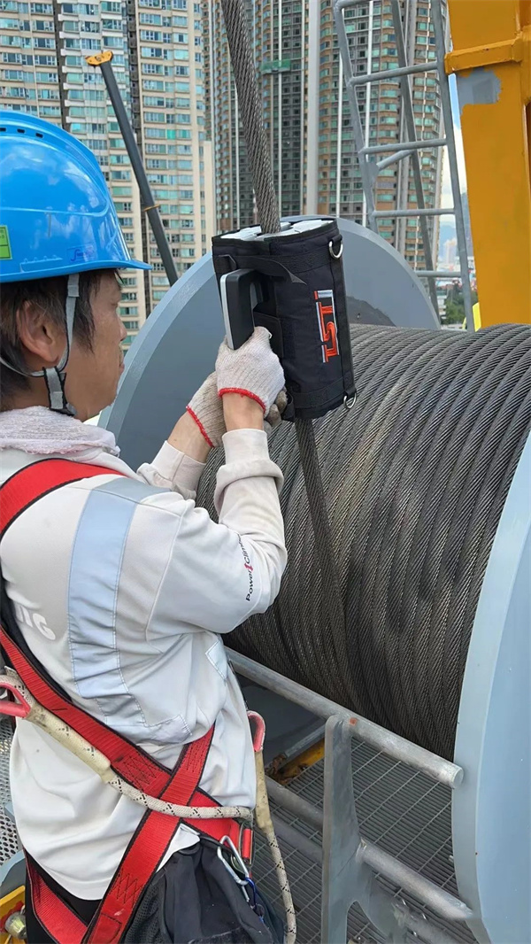 香港塔机租赁公司引进的TST便携式钢丝绳探伤系统,是专为钢丝绳无损探伤设计开发,单人携带即探即离,易于临时安装、方便转移;其应用广泛,可对静止不运动的钢丝绳进行探伤;还可对运动的钢丝绳进行探伤;既适合对在役钢丝绳易耗、易损的局部部位定期进行探伤;也适合定期、不定期对钢丝绳进行巡回“点检”探伤工作。