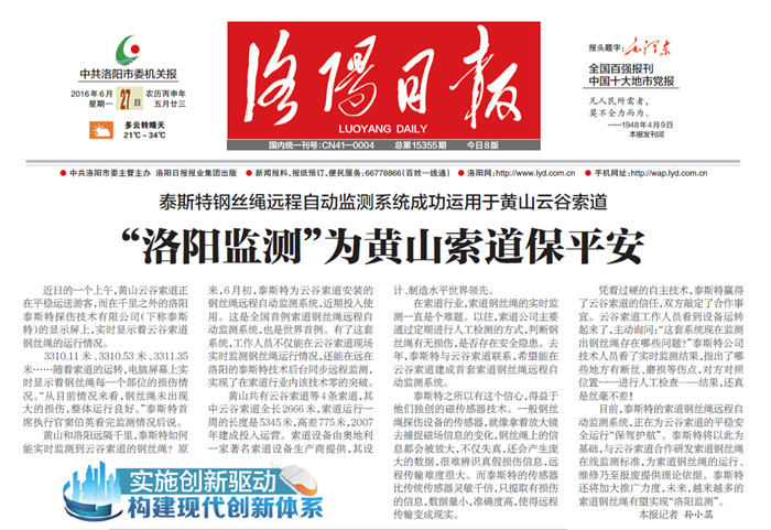目前,泰斯特的索道钢丝绳远程自动监测系统,正在为云谷索道的平稳安运行“保驾护航”。泰斯特将以此为基础,与云谷索道合作研发索道钢丝绳在线监测标准,为索道钢丝绳的运行、维修乃至报废提供理论依据。泰斯特还将加大推广力度,未来,越来越多的索道钢丝绳有望实现“洛阳监测”。
